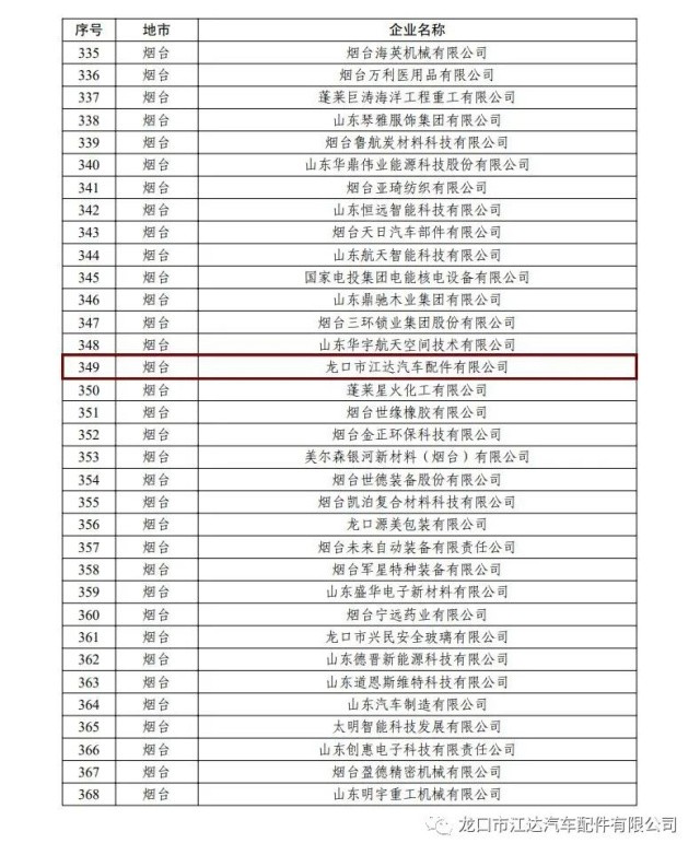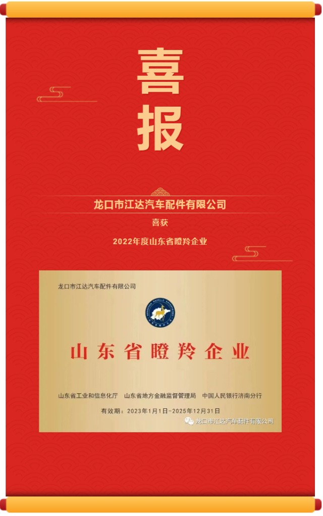 2022年7月19日,山東省工業和信息化廳公布了2022年度“山東省瞪羚企業”名單, 龍口市江達汽車配件有限公司榜上有名,榮膺“山東省瞪羚企業”稱號。