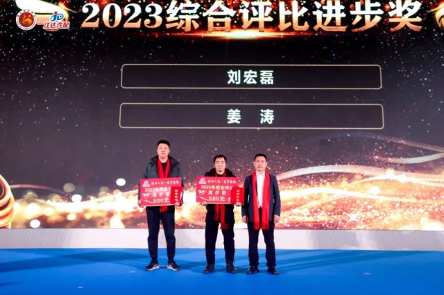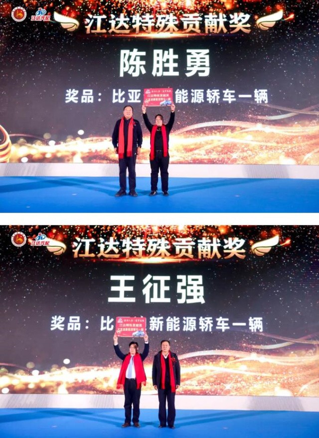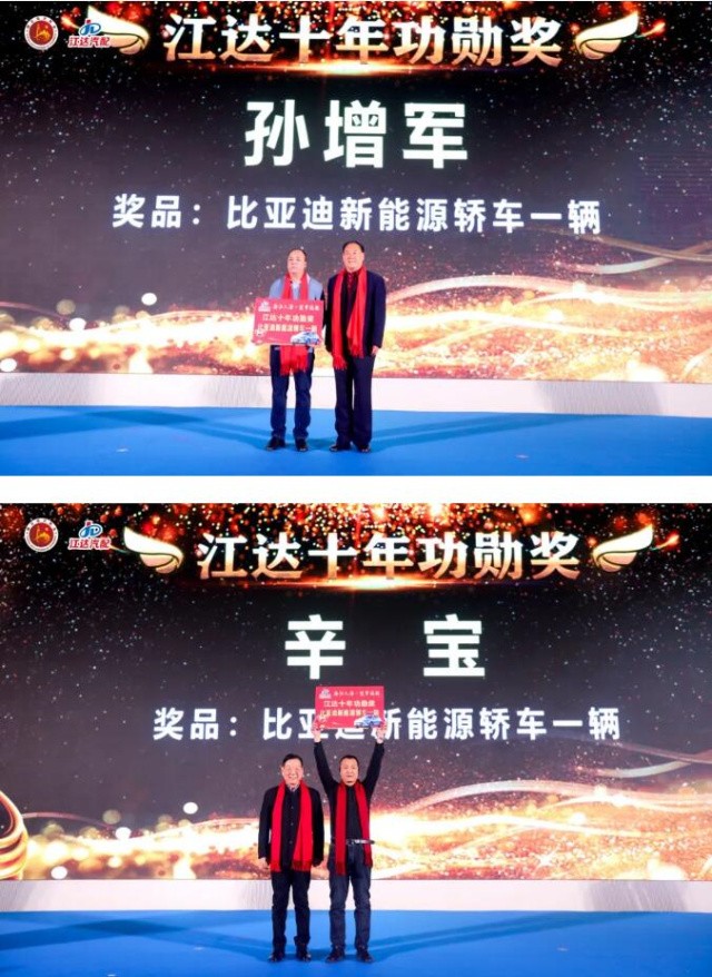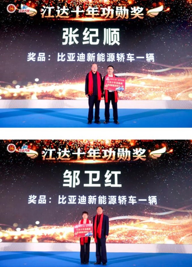 大會頒發令人激動的大獎,江達十年功勛獎和突出貢獻獎兩個大的獎項,獎勵比亞迪新能源電動轎車和現金。