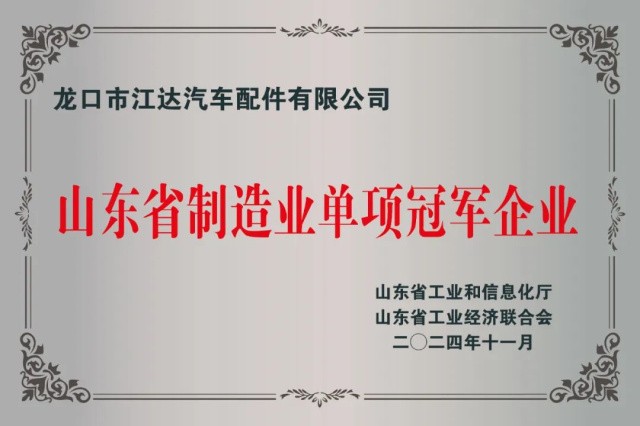 2024年11月,江達汽配新能源特種車輛零部件項目經過市級推薦申報,山東省工業信息化廳將龍口市江達汽車配件有限公司列為山東省第八批制造業單項冠軍企業。